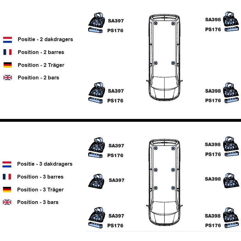 Achtung! Eine nachträgliche Erweiterung des Dachträgersets ist nicht möglich. Einzelne Streben sind nicht verfügbar! Darüber hinaus hat jeder Dachträger eine spezifische Position auf dem Dach. Es ist daher wichtig, den Dachträger gemäß der Anleitung zu montieren.