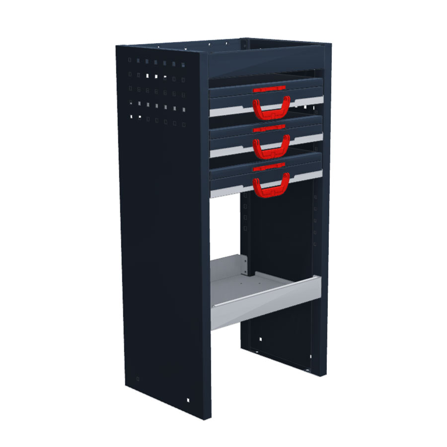 Die B-Line Fahrzeugeinrichtung besteht aus hochwertigem Stahl und ist mit einer langlebigen Pulverbeschichtung versehen. Die Schränke für Transporter werden als Bausatz geliefert. Dadurch profitieren Sie von einem günstigeren Preis im Vergleich zu vormontierten Systemen. Diese Metallfahrzeugeinrichtung ist leicht, zugleich stabil und sicherheitsgeprüft, unter anderem durch einen bestandenen Crashtest sowie ein TÜV-Zertifikat. Dank der fünfjährigen Garantie ist eine langfristige Zuverlässigkeit gewährleistet.
