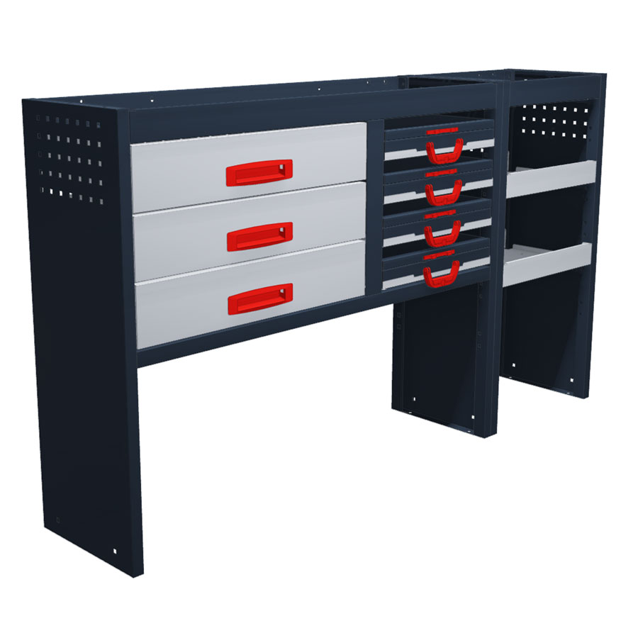 Das Komfort Paket ist vollständig ausgestattet, sodass Sie sowohl kleinere Materialien als auch größere Bauteile problemlos aufbewahren können. Der verfügbare Stauraum wird optimal genutzt und die Fahrzeugeinrichtung passt perfekt in Ihren Fiat Scudo. Dieses Paket eignet sich ideal für Fachkräfte, die Kleinteile übersichtlich lagern möchten, wie zum Beispiel Elektriker oder Monteure.
