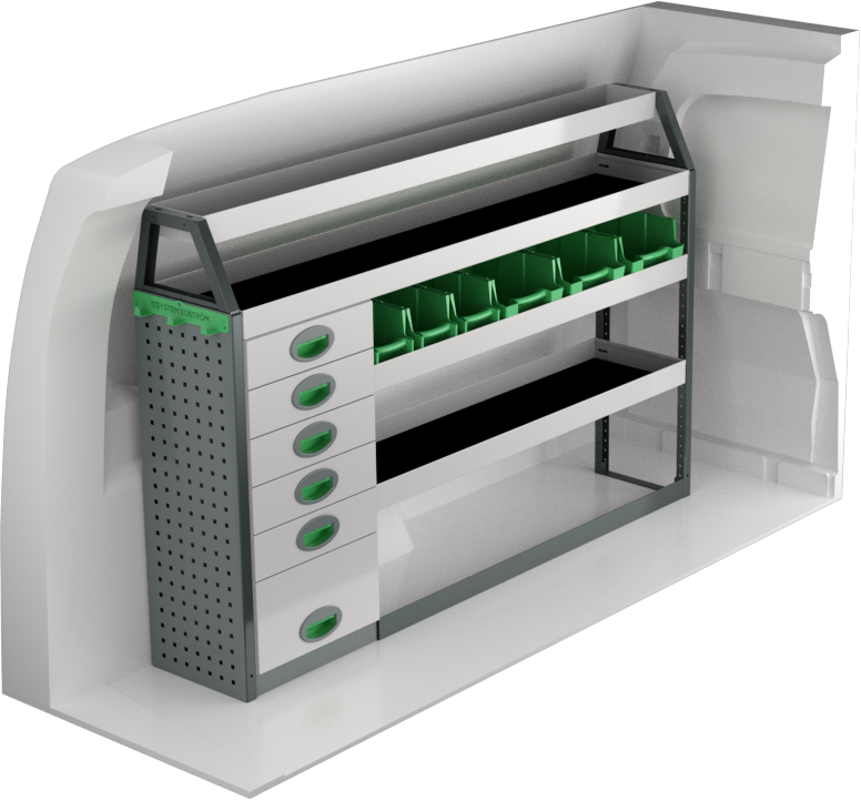 Fahrzeugeinrichtung Ford Transit Connect 2024+ Premium Line | L2 | 1631x300x1075 mm | 4 Regalböden + 4 Schubladen