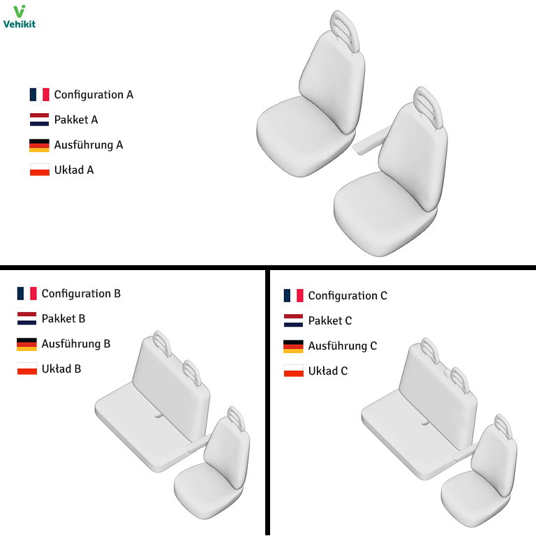 Diese Sitzbezüge werden maßgeschneidert für Ihren Iveco Daily hergestellt. Sie passen sich perfekt den verschiedenen Teilen des Sitzes oder der Bank an und machen keine Falten. Da Sicherheit oberste Priorität hat, sind diese Bezüge selbstverständlich airbag-kompatibel. Bei einem Unfall reißen die patentierten elastischen Nähte leicht, um das Auslösen des Airbags zu ermöglichen. Ob für eine vordere Bank oder einzelne Sitze, unsere Bezüge garantieren Ihnen somit eine optimale Abdeckung. In der nachstehenden Tabelle sehen Sie die verschiedenen verfügbaren Optionen sowie den Inhalt jedes Sets: