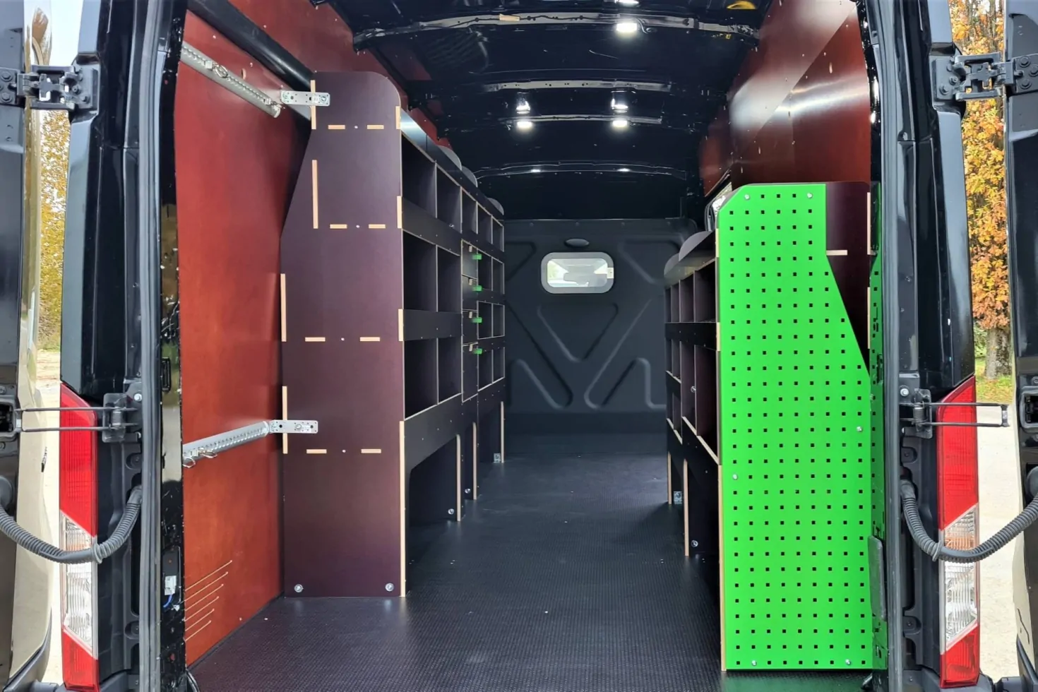 Wenn Sie eine Fahrzeugeinrichtung in Ihrem Transporter installieren möchten, sollten Sie dies bereits bei der Wahl Ihrer Laderaumschutz-Verkleidung berücksichtigen. Mit einem 12 mm starken Ladeboden müssen Sie nicht durch den originalen Fahrzeugboden bohren, um Regale sicher zu befestigen.