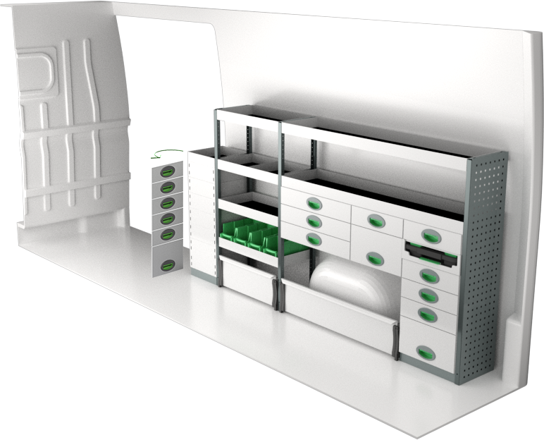 Eine optimale Raumnutzung ist von entscheidender Bedeutung, um die Produktivität und Funktionalität von Nutzfahrzeugen zu optimieren. Die gut durchdachte Fahrzeugeinrichtung der Premium Line ermöglicht nicht nur eine maximale Nutzung des verfügbaren Raums, sondern trägt zur Verbesserung der Arbeitsabläufe bei. Mit dieser Fahrzeugeinrichtung aus Metall in den Farben Grau und Grün wird jeder Zentimeter Ihres Citroen Jumper optimal genutzt. Die intelligent gestalteten Regalsysteme sorgen dafür, dass Sie alle benötigten Materialien direkt griffbereit haben, ohne Zeit mit der Suche nach Werkzeugen zu verschwenden. Mit einer durchdachten Anordnung von Regalfächern, Schubladen oder Arbeitsflächen haben Sie alle häufig benötigten Utensilien jederzeit griffbereit. Dadurch wird Ihr Arbeitsaufwand minimiert und Sie sparen sich eine Menge Zeit. Mit Hilfe der vorgebohrten Löcher können Sie das Regalsystem für verschiedene Aufgaben und Anforderungen anpassen.