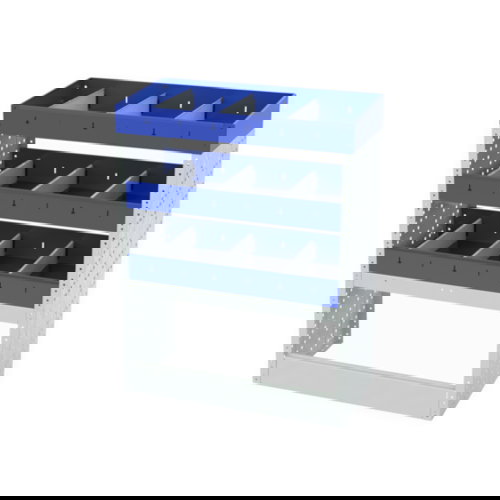 Wenn Ihr Transporter nicht richtig eingeräumt ist, verlieren Sie Zeit bei der Suche nach Ihrem Werkzeug. Mit dieser Fahrzeugeinrichtung können Sie geordnet und übersichtlich arbeiten. Die verschiedenen Optionen, aus denen sich dieser Schrank zusammensetzt, ermöglicht es Ihnen, sowohl große Geräte (Bohrer, Schraubendreher, Hämmer, Werkzeugkästen usw.) als auch kleine Geräte (Schrauben, Zubehör usw.) zu verstauen.