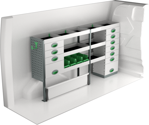 Eine optimale Raumnutzung ist von entscheidender Bedeutung, um die Produktivität und Funktionalität von Nutzfahrzeugen zu optimieren. Die gut durchdachte Fahrzeugeinrichtung der Premium Line ermöglicht nicht nur eine maximale Nutzung des verfügbaren Raums, sondern trägt zur Verbesserung der Arbeitsabläufe bei. Mit dieser Fahrzeugeinrichtung aus Metall in den Farben Grau und Grün wird jeder Zentimeter Ihres Ford Transit Custom optimal genutzt. Die intelligent gestalteten Regalsysteme sorgen dafür, dass Sie alle benötigten Materialien direkt griffbereit haben, ohne Zeit mit der Suche nach Werkzeugen zu verschwenden. Mit einer durchdachten Anordnung von Regalfächern, Schubladen oder Arbeitsflächen haben Sie alle häufig benötigten Utensilien jederzeit griffbereit. Dadurch wird Ihr Arbeitsaufwand minimiert und Sie sparen sich eine Menge Zeit. Mit Hilfe der vorgebohrten Löcher können Sie das Regalsystem für verschiedene Aufgaben und Anforderungen anpassen.