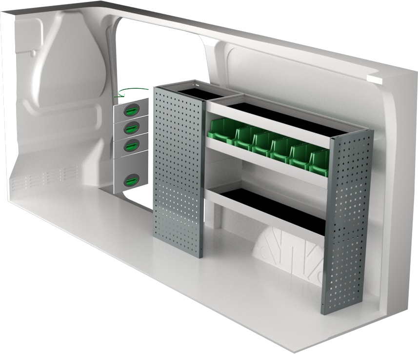 Eine optimale Raumnutzung ist von entscheidender Bedeutung, um die Produktivität und Funktionalität von Nutzfahrzeugen zu optimieren. Die gut durchdachte Fahrzeugeinrichtung der Premium Line ermöglicht nicht nur eine maximale Nutzung des verfügbaren Raums, sondern trägt zur Verbesserung der Arbeitsabläufe bei. Mit dieser Fahrzeugeinrichtung aus Metall in den Farben Grau und Grün wird jeder Zentimeter Ihres Ford Transit Custom optimal genutzt. Die intelligent gestalteten Regalsysteme sorgen dafür, dass Sie alle benötigten Materialien direkt griffbereit haben, ohne Zeit mit der Suche nach Werkzeugen zu verschwenden. Mit einer durchdachten Anordnung von Regalfächern, Schubladen oder Arbeitsflächen haben Sie alle häufig benötigten Utensilien jederzeit griffbereit. Dadurch wird Ihr Arbeitsaufwand minimiert und Sie sparen sich eine Menge Zeit. Mit Hilfe der vorgebohrten Löcher können Sie das Regalsystem für verschiedene Aufgaben und Anforderungen anpassen.