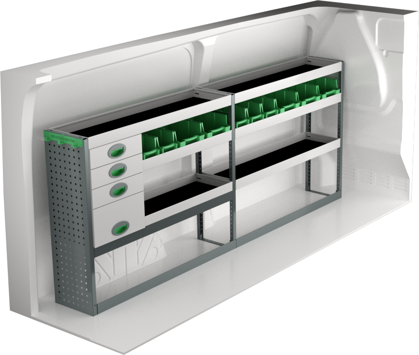 Eine optimale Raumnutzung ist von entscheidender Bedeutung, um die Produktivität und Funktionalität von Nutzfahrzeugen zu optimieren. Die gut durchdachte Fahrzeugeinrichtung der Premium Line ermöglicht nicht nur eine maximale Nutzung des verfügbaren Raums, sondern trägt zur Verbesserung der Arbeitsabläufe bei. Mit dieser Fahrzeugeinrichtung aus Metall in den Farben Grau und Grün wird jeder Zentimeter Ihres Ford Transit Custom optimal genutzt. Die intelligent gestalteten Regalsysteme sorgen dafür, dass Sie alle benötigten Materialien direkt griffbereit haben, ohne Zeit mit der Suche nach Werkzeugen zu verschwenden. Mit einer durchdachten Anordnung von Regalfächern, Schubladen oder Arbeitsflächen haben Sie alle häufig benötigten Utensilien jederzeit griffbereit. Dadurch wird Ihr Arbeitsaufwand minimiert und Sie sparen sich eine Menge Zeit. Mit Hilfe der vorgebohrten Löcher können Sie das Regalsystem für verschiedene Aufgaben und Anforderungen anpassen.