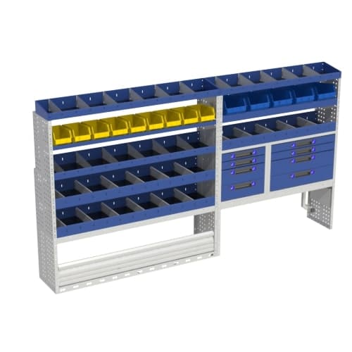 Wenn Ihr Transporter nicht richtig eingeräumt ist, verlieren Sie Zeit bei der Suche nach Ihrem Werkzeug. Mit dieser Fahrzeugeinrichtung können Sie geordnet und übersichtlich arbeiten. Die verschiedenen Optionen, aus denen sich dieser Schrank zusammensetzt, ermöglicht es Ihnen, sowohl große Geräte (Bohrer, Schraubendreher, Hämmer, Werkzeugkästen usw.) als auch kleine Geräte (Schrauben, Zubehör usw.) zu verstauen.