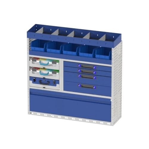 Wenn Ihr Transporter nicht richtig eingeräumt ist, verlieren Sie Zeit bei der Suche nach Ihrem Werkzeug. Mit dieser Fahrzeugeinrichtung können Sie geordnet und übersichtlich arbeiten. Die verschiedenen Optionen, aus denen sich dieser Schrank zusammensetzt, ermöglicht es Ihnen, sowohl große Geräte (Bohrer, Schraubendreher, Hämmer, Werkzeugkästen usw.) als auch kleine Geräte (Schrauben, Zubehör usw.) zu verstauen.