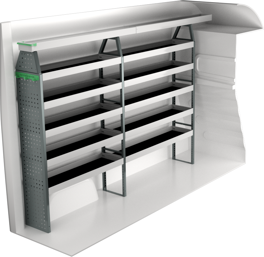 Eine optimale Raumnutzung ist von entscheidender Bedeutung, um die Produktivität und Funktionalität von Nutzfahrzeugen zu optimieren. Die gut durchdachte Fahrzeugeinrichtung der Premium Line ermöglicht nicht nur eine maximale Nutzung des verfügbaren Raums, sondern trägt zur Verbesserung der Arbeitsabläufe bei. Mit dieser Fahrzeugeinrichtung aus Metall in den Farben Grau und Grün wird jeder Zentimeter Ihres Nissan NV300 optimal genutzt. Die intelligent gestalteten Regalsysteme sorgen dafür, dass Sie alle benötigten Materialien direkt griffbereit haben, ohne Zeit mit der Suche nach Werkzeugen zu verschwenden. Mit einer durchdachten Anordnung von Regalfächern, Schubladen oder Arbeitsflächen haben Sie alle häufig benötigten Utensilien jederzeit griffbereit. Dadurch wird Ihr Arbeitsaufwand minimiert und Sie sparen sich eine Menge Zeit. Mit Hilfe der vorgebohrten Löcher können Sie das Regalsystem für verschiedene Aufgaben und Anforderungen anpassen.