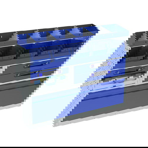 Wenn Ihr Transporter nicht richtig eingeräumt ist, verlieren Sie Zeit bei der Suche nach Ihrem Werkzeug. Mit dieser Fahrzeugeinrichtung können Sie geordnet und übersichtlich arbeiten. Die verschiedenen Optionen, aus denen sich dieser Schrank zusammensetzt, ermöglicht es Ihnen, sowohl große Geräte (Bohrer, Schraubendreher, Hämmer, Werkzeugkästen usw.) als auch kleine Geräte (Schrauben, Zubehör usw.) zu verstauen.