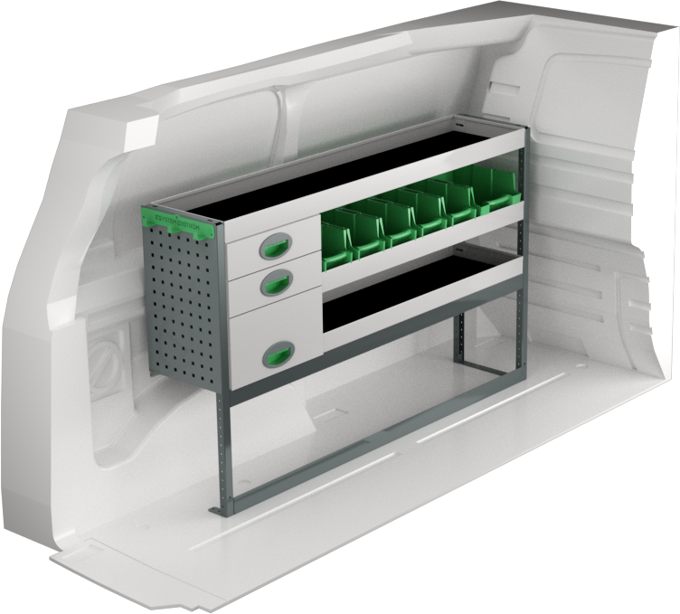 Eine optimale Raumnutzung ist von entscheidender Bedeutung, um die Produktivität und Funktionalität von Nutzfahrzeugen zu optimieren. Die gut durchdachte Fahrzeugeinrichtung der Premium Line ermöglicht nicht nur eine maximale Nutzung des verfügbaren Raums, sondern trägt zur Verbesserung der Arbeitsabläufe bei. Mit dieser Fahrzeugeinrichtung aus Metall in den Farben Grau und Grün wird jeder Zentimeter Ihres Volkswagen ID Buzz optimal genutzt. Die intelligent gestalteten Regalsysteme sorgen dafür, dass Sie alle benötigten Materialien direkt griffbereit haben, ohne Zeit mit der Suche nach Werkzeugen zu verschwenden. Mit einer durchdachten Anordnung von Regalfächern, Schubladen oder Arbeitsflächen haben Sie alle häufig benötigten Utensilien jederzeit griffbereit. Dadurch wird Ihr Arbeitsaufwand minimiert und Sie sparen sich eine Menge Zeit. Mit Hilfe der vorgebohrten Löcher können Sie das Regalsystem für verschiedene Aufgaben und Anforderungen anpassen.