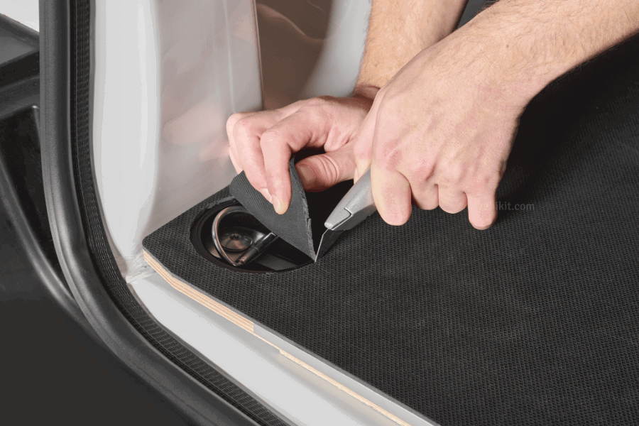 Bei der Benutzung dieser Laderaummatte sind die Zurrösen (wenn vorhanden) in dem Laderaum optimal zugänglich. An den Stellen der Zurrösen sind subtile Schnittlinien, wodurch man die Öffnungen einfach mit den Fingern rausdrücken kann. Hierfür werden keine Werkzeuge benötigt. Auf diese Weise genießen Sie den Schutz einer dichten Matte sowie die Möglichkeit um die Ladung zu sichern. Benutzen Sie die Zurrösen lieber nicht? Dann lassen Sie die Aussparungen zu und genießen eine nahtlose Fläche.