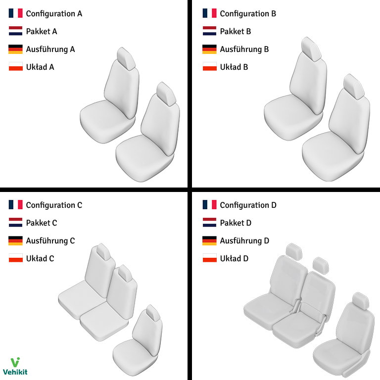 Da unsere Stoff-Sitzbezüge maßgeschneidert sind, passen sie sich perfekt der Form Ihrer Vordersitze an – ganz gleich, ob Sie die Konfiguration Sitz–Sitz oder Sitzbank wählen. Damit die Sicherheit im Falle eines Unfalls nicht beeinträchtigt wird, reißen die Nähte der Bezüge leicht auf, sobald sich der Airbag auslöst. Für einen optimalen Sitz wählen Sie bitte das Bezug-Set, das zu Ihrem Fahrzeug passt. In der Tabelle unten sehen Sie den Lieferumfang der Sets und die verschiedenen Optionen, die wir anbieten: