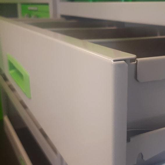 Cet aménagement se compose de :1 x tablette supérieure avec 3 séparations / 1 x plateau avec 4 bacs en plastique amovibles / 1 x étage avec 3 séparations / 1 x tiroir . Assez de compartiments pour pouvoir ranger intelligemment tout votre matériel. L’aluminium et l’acier vous assurent une excellente résistance.