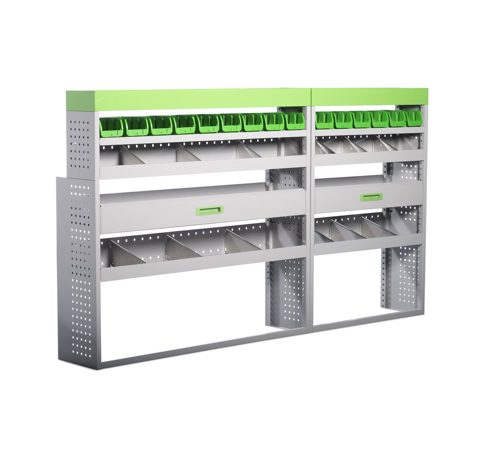 Cet aménagement se compose de :2 x étagères supérieures / 15 bacs plastiques amovibles / 2 x compartiments avec un total de 6 diviseurs/ 2 x tiroirs. Assez de compartiments pour pouvoir ranger intelligemment tout votre matériel. L’aluminium et l’acier vous assurent une excellente résistance.