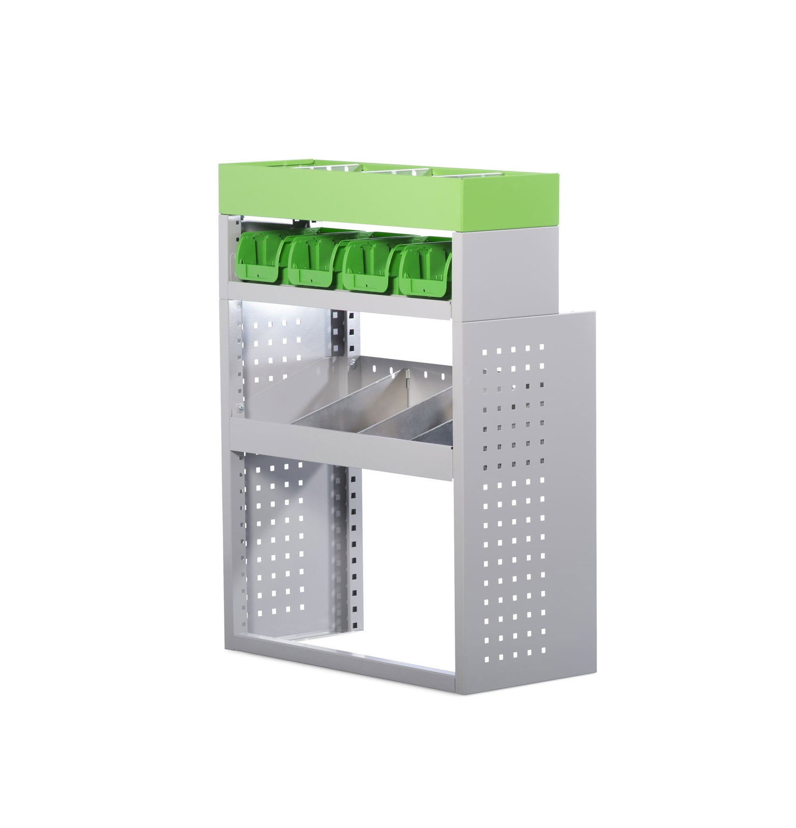 Cet aménagement se compose de :1 x tablette supérieure avec 3 séparations / 1 x plateau avec 4 bacs en plastique amovibles / 1 x étage avec 3 séparations / 1 x tiroir . Assez de compartiments pour pouvoir ranger intelligemment tout votre matériel. L’aluminium et l’acier vous assurent une excellente résistance.