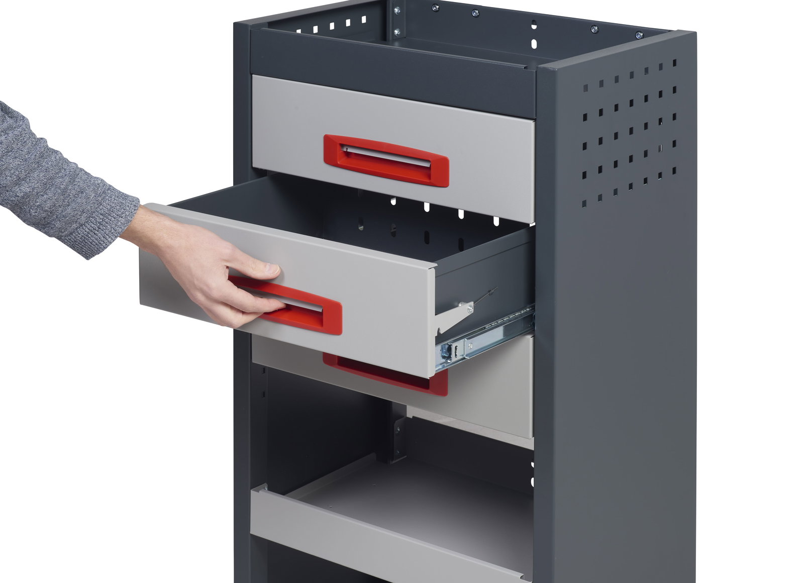 Ce kit est conçu pour rentrer parfaitement dans l’espace de chargement de votre Citroen ë-Jumpy. Les étagères ont une profondeur de 340 mm, ce qui permet d'y placer facilement des caisses à outils, telles que Festool et Makita. Avec une capacité de charge de 40 kg par étagère, 50 kg par tiroir et 15 kg par valise, vous pouvez transporter beaucoup de matériel. Si vous souhaitez sécuriser davantage votre système de rangement et votre matériel, pensez à installer des serrures sur les portes de votre utilitaire.