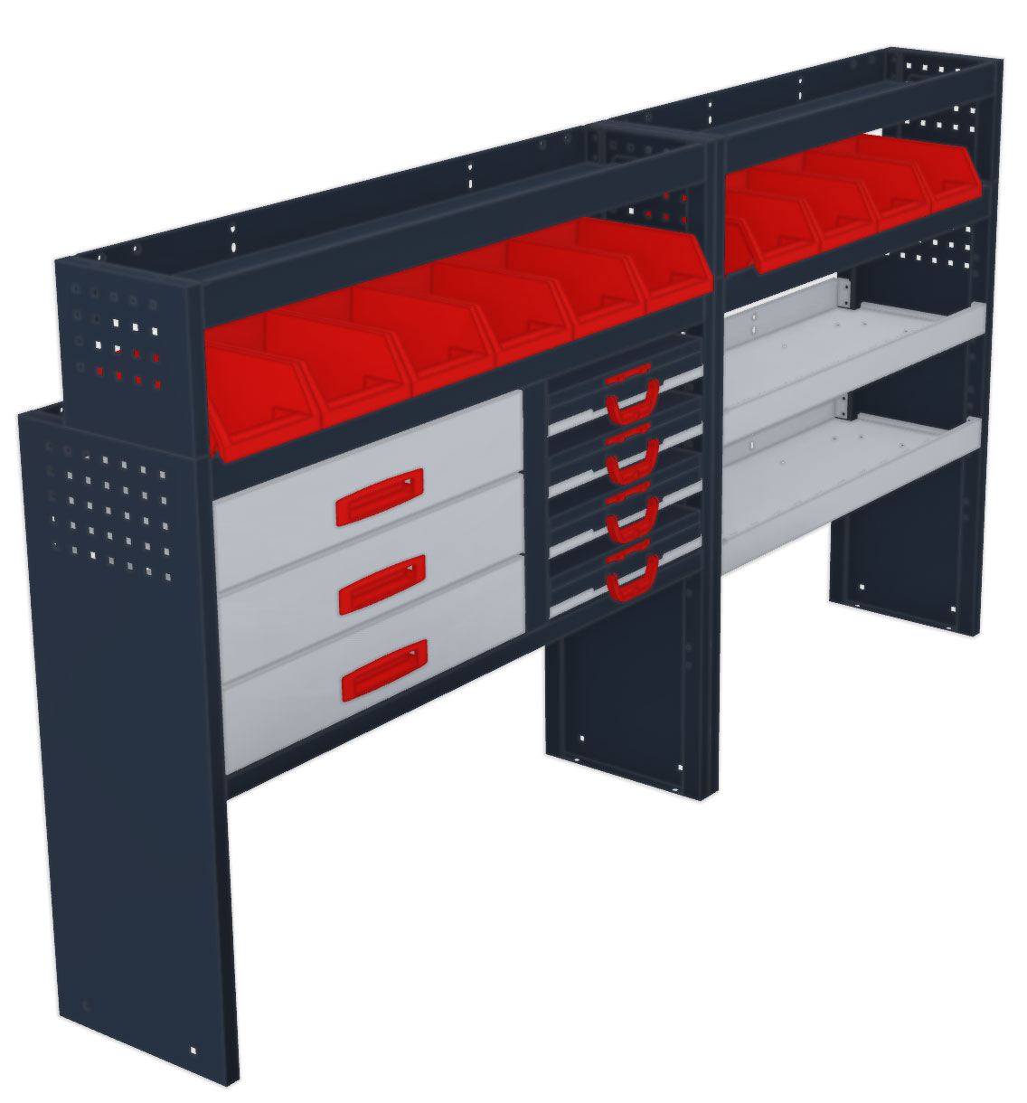 Cet aménagement est livré avec le matériel et la notice nécessaire au montage. Une fois assemblé, il se fixe aux parois et au plancher de votre utilitaire à l’aide des vis et des supports de fixation fournis. Vous souhaitez placer plusieurs étagères côte à côte ? Vous pouvez les connecter facilement entre elles pour plus de stabilité.