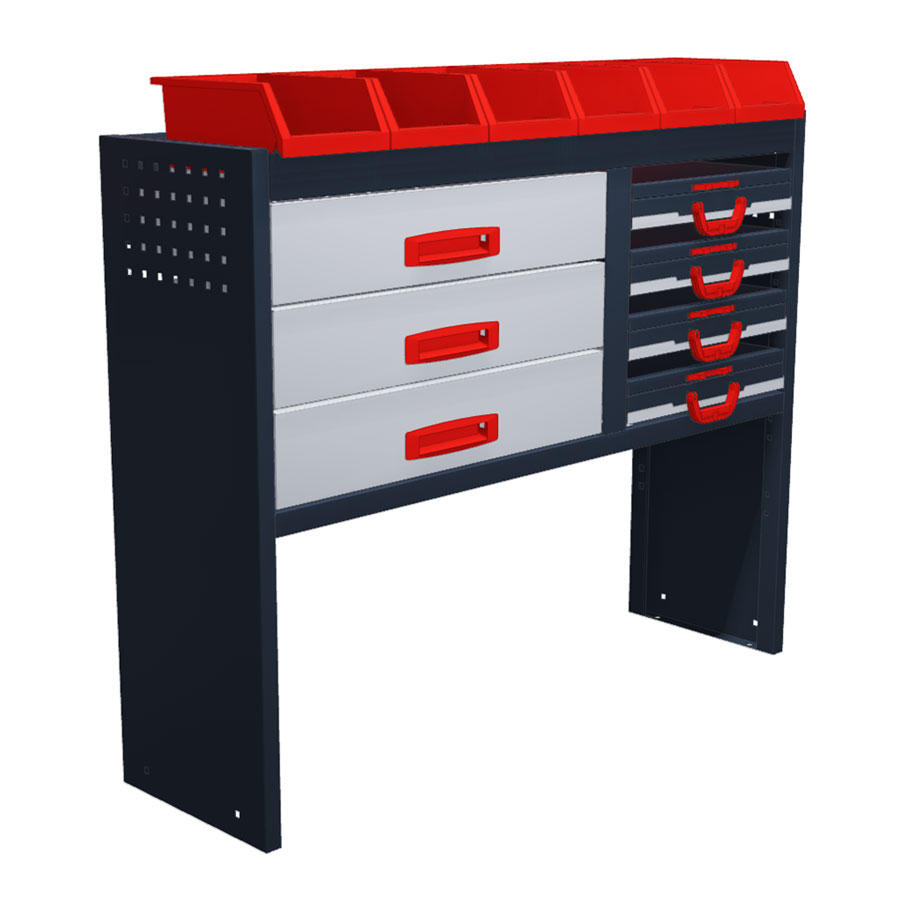 Ce kit est conçu pour rentrer parfaitement dans l’espace de chargement de votre Opel Combo. Les étagères ont une profondeur de 340 mm, ce qui permet d'y placer facilement des caisses à outils, telles que Festool et Makita. Avec une capacité de charge de 40 kg par étagère, 50 kg par tiroir et 15 kg par valise, vous pouvez transporter beaucoup de matériel. Si vous souhaitez sécuriser davantage votre système de rangement et votre matériel, pensez à installer des serrures sur les portes de votre utilitaire.