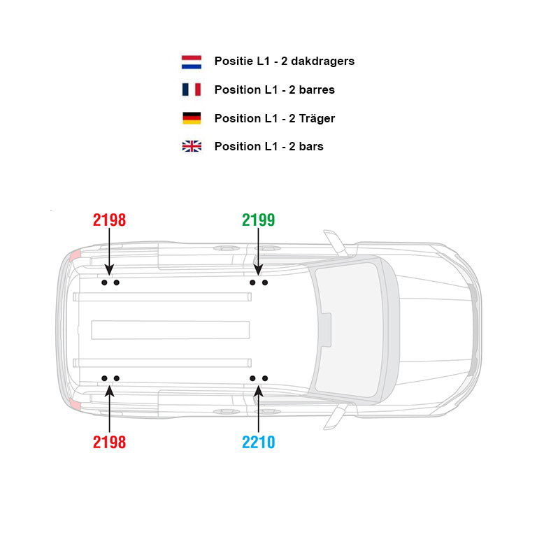 Attention ! Si vous achetez un lot de 2 barres, il ne sera pas possible d'acheter une troisième ou quatrième barre par la suite, les barres n’étant pas vendues de manière détachée. De plus, chaque barre a une position prédéfinie sur le toit, vous ne pouvez pas les placer où vous le souhaitez. Il est donc important de monter les barres de toit conformément aux instructions.