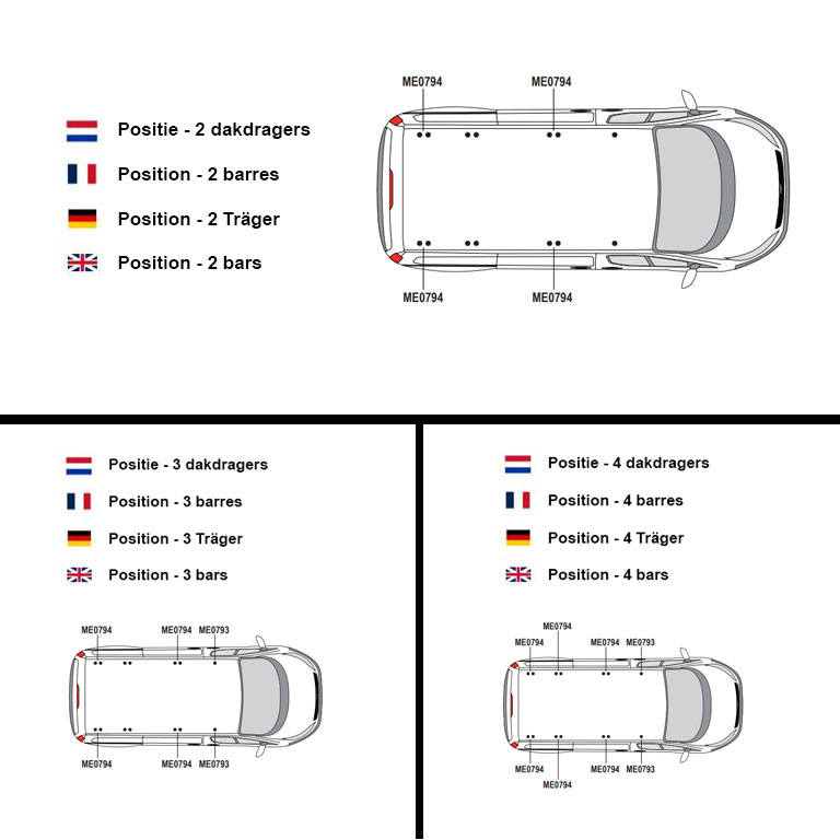 Attention ! Si vous achetez un lot de 2 barres, il ne sera pas possible d'acheter une troisième ou quatrième barre par la suite, les barres n’étant pas vendues de manière détachée. De plus, chaque barre a une position prédéfinie sur le toit, vous ne pouvez pas les placer où vous le souhaitez. Il est donc important de monter les barres de toit conformément aux instructions.