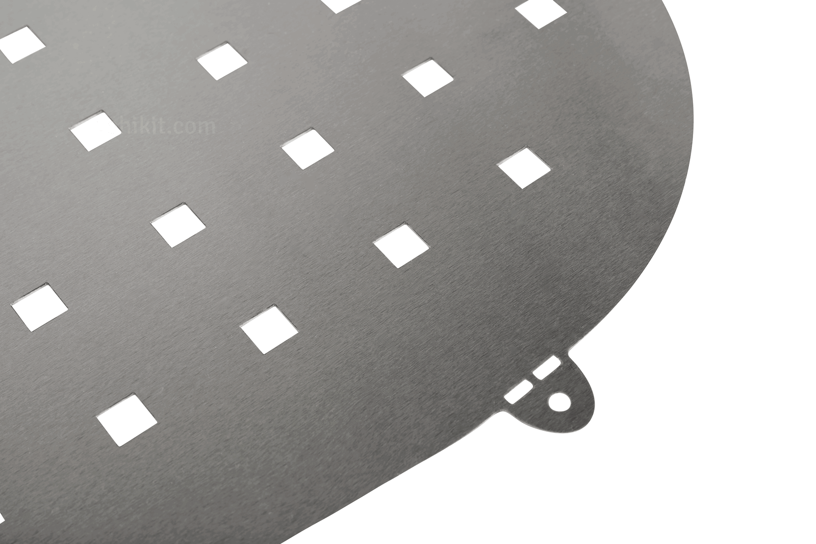 Les panneaux ont une épaisseur de 1 mm et sont dotés d’un rebord de 50 mm sur tout le pourtour. Ils comportent des perforations de 9,85 mm qui forment une grille de 38 mm.
