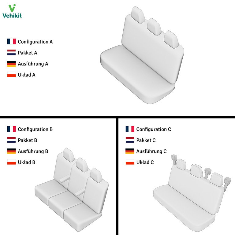 Les housses sont fabriquées sur mesure et épousent parfaitement la forme de votre banquette arrière. Leur coupe ajustée évite les plis peu esthétiques. Vos passagers peuvent donc voyager avec vous de manière confortable. Nous vous proposons deux configurations différentes afin que vous choisissiez celle qui correspond le mieux à vos sièges (voir tableau ci-dessous).| Housses de siège arrière (double cabine) | |||