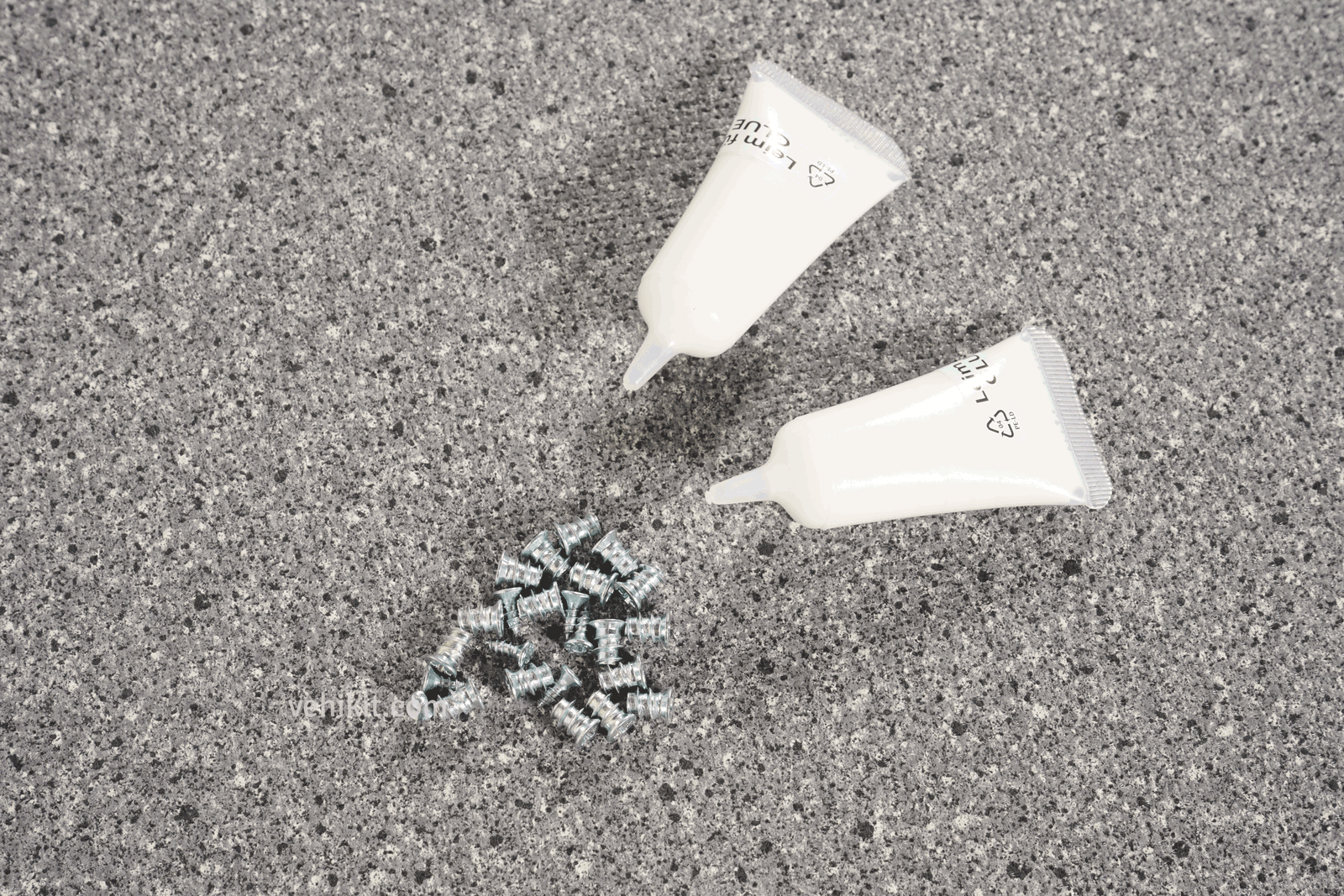 Pour plus de stabilité, nous recommandons de coller le plancher à l’aide d’un mastic à même le sol en métal de votre véhicule, afin d’éviter tout déplacement ou vibration. Nous conseillons d’utiliser la colle SIKA Flex 252, mais des produits similaires conviennent également. Attention : le mastic n’est pas fourni. Fixez ensuite le plancher de chargement à l'aide de coupelles que vous montez sur les anneaux d'arrimage.