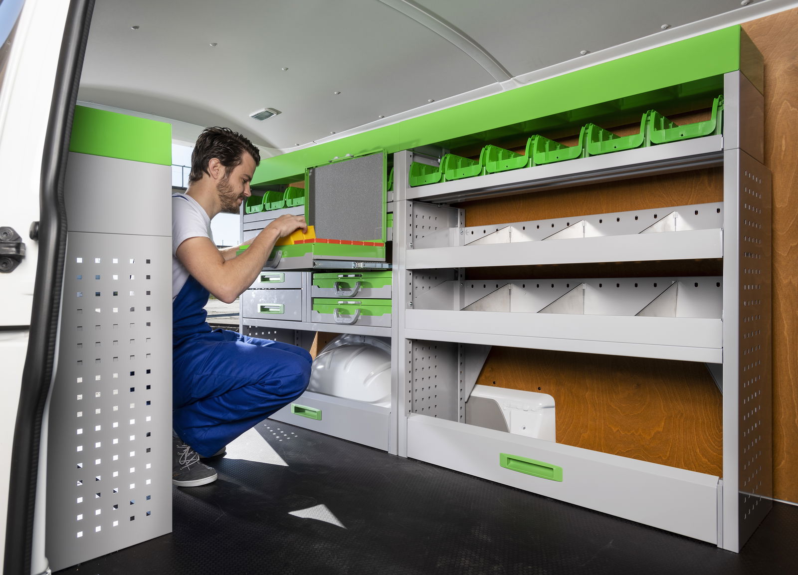 En outre, l'aménagement des armoires contribue également à la sécurité en évitant que des objets ne traînent dans la camionnette. Vous pouvez donc travailler en toute sécurité et transporter davantage sans perdre votre vue d'ensemble.