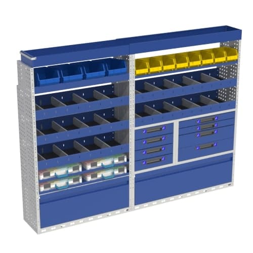 Lors de vos missions, si votre utilitaire n'est pas rangé, vous perdez du temps à chercher vos outils. Ce meuble de rangement vous permet de travailler de façon organisée. Les différentes options qui composent cet aménagement vous permettent de ranger du matériel imposant (perceuse, visseuse, marteaux, caisses à outils etc) et du matériel de petite taille (visserie, accessoires etc).