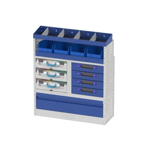 Lors de vos missions, si votre utilitaire n'est pas rangé, vous perdez du temps à chercher vos outils. Ce meuble de rangement vous permet de travailler de façon organisée. Les différentes options qui composent cet aménagement vous permettent de ranger du matériel imposant (perceuse, visseuse, marteaux, caisses à outils etc) et du matériel de petite taille (visserie, accessoires etc).