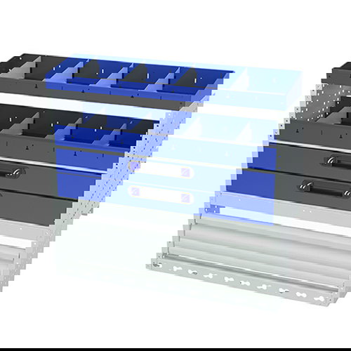 Lors de vos missions, si votre utilitaire n'est pas rangé, vous perdez du temps à chercher vos outils. Ce meuble de rangement vous permet de travailler de façon organisée. Les différentes options qui composent cet aménagement vous permettent de ranger du matériel imposant (perceuse, visseuse, marteaux, caisses à outils etc) et du matériel de petite taille (visserie, accessoires etc).