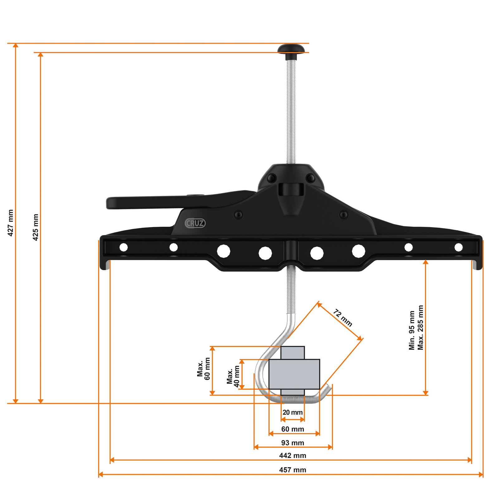 Ces attache-échelles permettent non seulement de ranger les échelles en toute sécurité, mais le design innovant de leur mécanisme permet également de fixer l'échelle en un rien de temps. Pour faciliter l’installation, une notice de montage est incluse. Les attache-échelles Cruz sont compatibles avec la plupart des barres et galeries de toit. Pour plus d’information, merci de vous référer à l’image présentant les dimensions du produit.