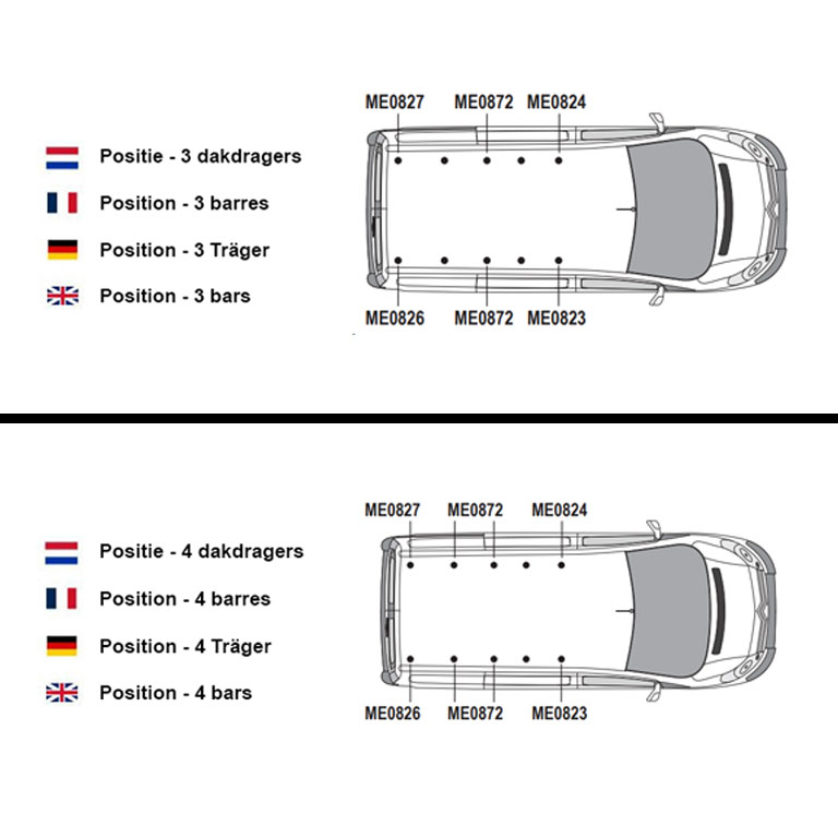 Attention ! Si vous achetez un lot de 2 barres, il ne sera pas possible d'acheter une troisième ou quatrième barre par la suite, les barres n’étant pas vendues de manière détachée. De plus, chaque barre a une position prédéfinie sur le toit, vous ne pouvez pas les placer où vous le souhaitez. Il est donc important de monter les barres de toit conformément aux instructions.