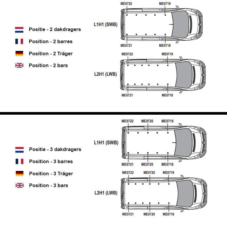 Attention ! Si vous achetez un lot de 2 barres, il ne sera pas possible d'acheter une troisième ou quatrième barre par la suite, les barres n’étant pas vendues de manière détachée. De plus, chaque barre a une position prédéfinie sur le toit, vous ne pouvez pas les placer où vous le souhaitez. Il est donc important de monter les barres de toit conformément aux instructions.