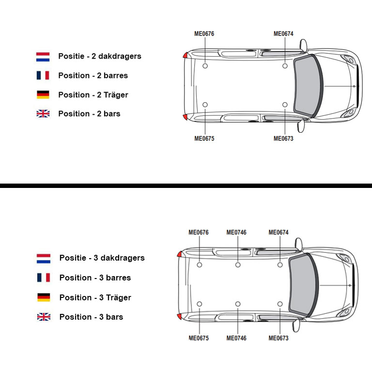 Attention ! Si vous achetez un lot de 2 barres, il ne sera pas possible d'acheter une troisième ou quatrième barre par la suite, les barres n’étant pas vendues de manière détachée. De plus, chaque barre a une position prédéfinie sur le toit, vous ne pouvez pas les placer où vous le souhaitez. Il est donc important de monter les barres de toit conformément aux instructions.