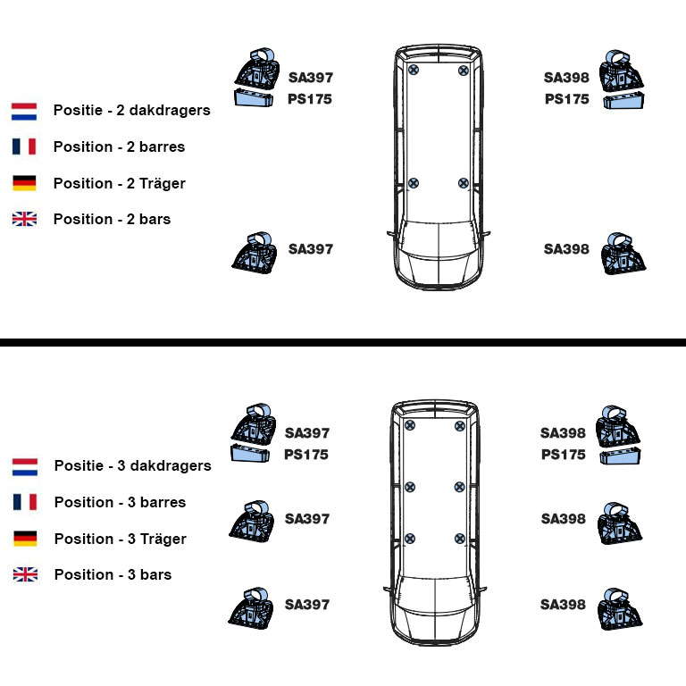 Attention! Si vous achetez un lot de 2 barres, il ne sera pas possible d’acheter une troisième ou quatrième barre par la suite, les barres n’étant pas vendues de manière détachée. De plus, chaque barre de toit a une position prédéfinie sur le toit, vous ne pouvez donc pas les placer où vous le souhaitez. Il est donc important de monter les barres de toit en suivant les instructions.