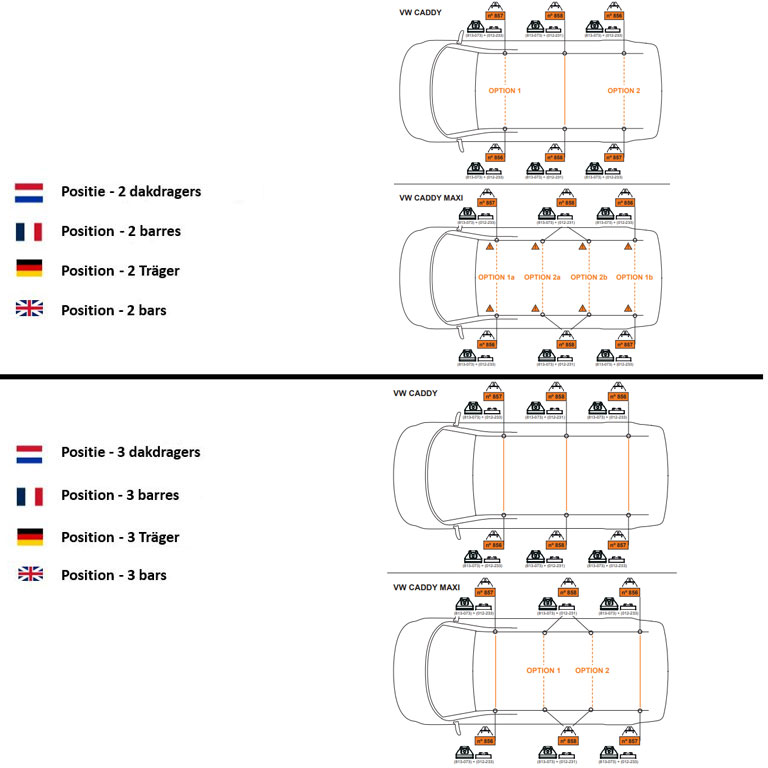 Attention! Si vous achetez un lot de 2 barres, il ne sera pas possible d’acheter une troisième ou quatrième barre par la suite, les barres n’étant pas vendues de manière détachée. De plus, chaque barre a une position prédéfinie sur le toit, vous ne pouvez pas les placer où vous le souhaitez. Il est donc important de monter les barres de toit en suivant les instructions.