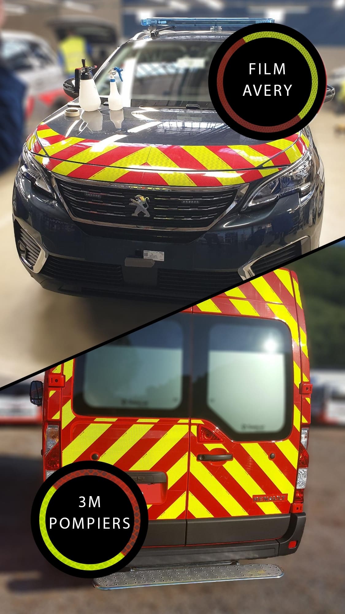 Vous êtes pompier/secouriste et voyagez à bord d’un véhicule de service d’incendie et de secours ? La reglementation vous impose d’utiliser des films homologués avec n° TPESC et nom du fabricant sur chaque strie jaune, sans quoi le balisage n’est pas réglementaire. Les kits jaune/rouge sont donc faits pour vous !