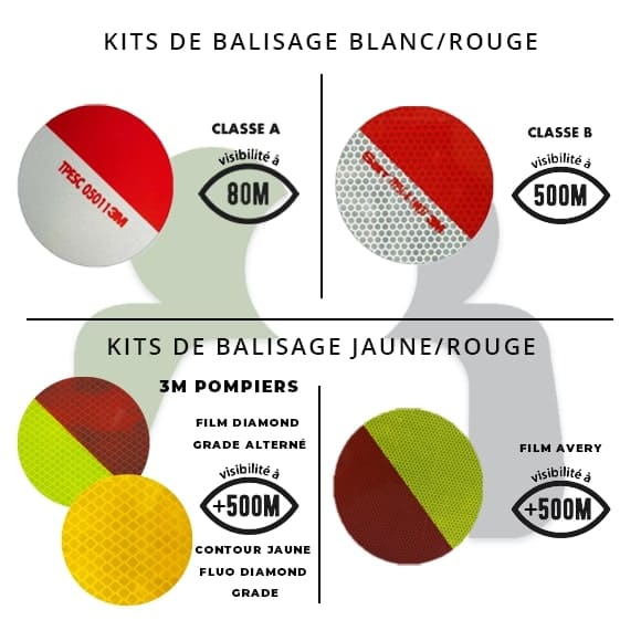 - Choix entre kits blanc/rouge (Classe A/B) et kits jaune/rouge (Pompiers 3M/Film Avery)