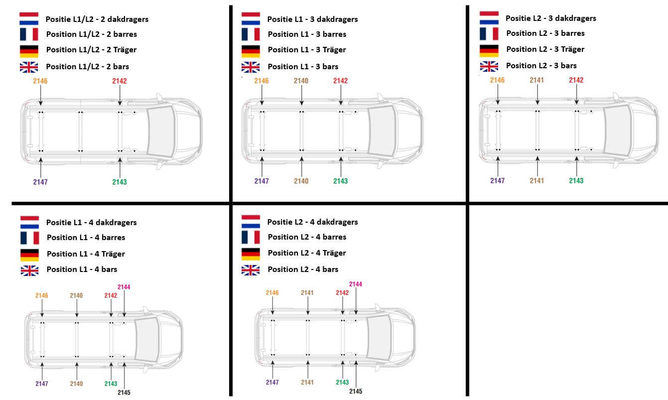 LET OP! Elke dakdrager heeft zijn eigen positie op het dak. Het is daarom van belang om de dakdragers volgens de instructie te monteren.
