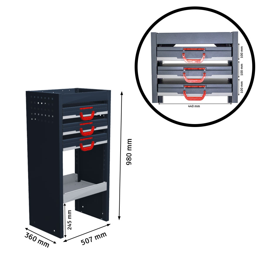 De B-Line kastinrichting is gemaakt uit hoogwaardig staal en afgewerkt met een poedercoating. De kast voor de bedrijfswagen worden geleverd als bouwpakket. Daardoor profiteert u van een lagere prijs in vergelijking met vooraf gemonteerde systemen. Deze metalen kastinrichting is licht van gewicht, maar stevig en getest op veiligheid, met onder andere een geslaagde crashtest en een TÜV certificaat. Dankzij de 5 jaar garantie bent u verzekerd van langdurige betrouwbaarheid.