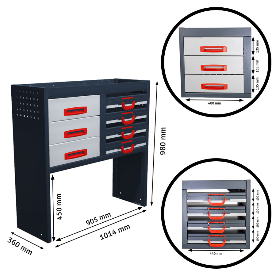 De lades hebben een binnenmaat van 400 mm breed, 325 mm diep en 115 mm hoog. De koffers hebben een grootte van 440 mm breed, 330 mm diep en 66 mm hoog. Met een draagkracht van 50 kg per lade, 15 kg per koffer en 40 kg per plank kunt u ruim voldoende materialen meenemen zonder in te leveren op veiligheid of stabiliteit. U kunt de kastmodule uitbreiden met accessoires die passen bij uw werkzaamheden.