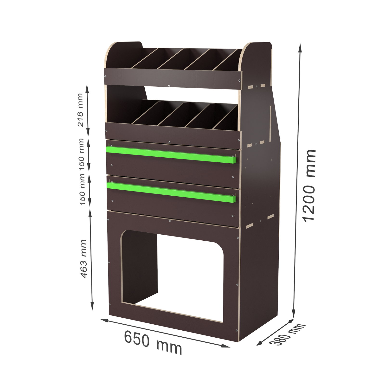 - Lengte 650 mm x Breedte 380 mm x Hoogte 1200 mm