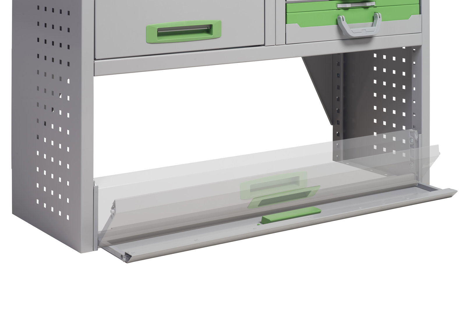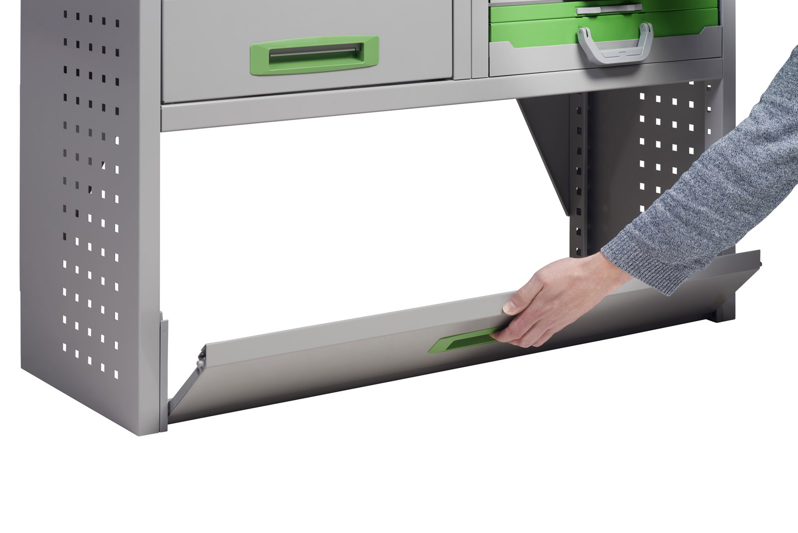 Met de legklep beschermt u uw spullen tegen het wegschuiven aan de onderzijde van uw bedrijfswageninrichting. Deze is omhoog te trekken en opzij te klappen. Hierdoor heeft u ruimte om de ruimte in te richten.