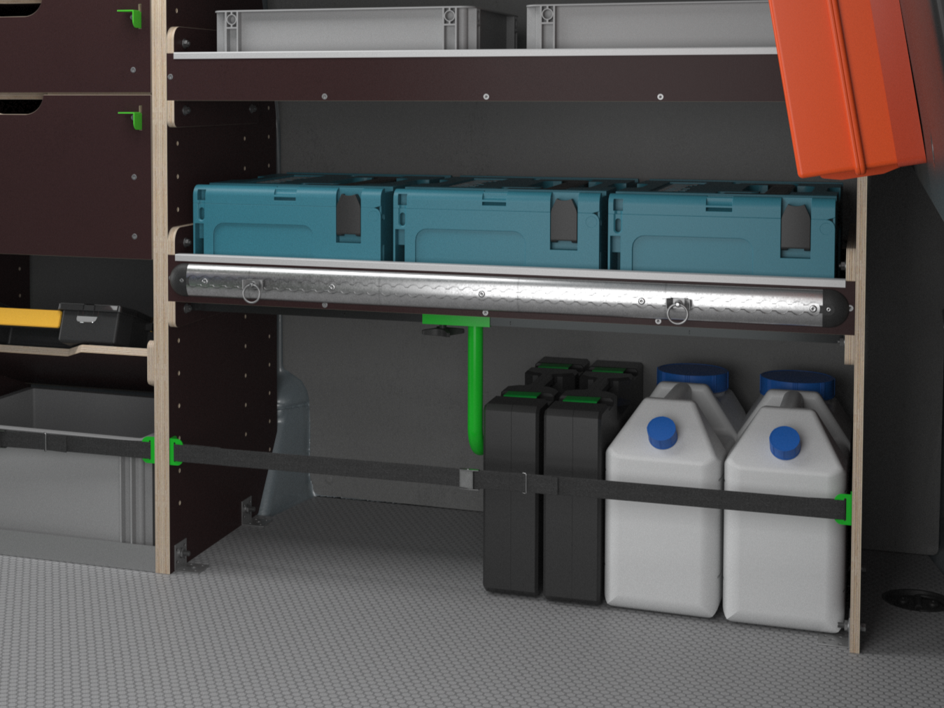De steun wordt direct onder de bodemplank gemonteerd. Het kan in slechts enkele minuten worden geïnstalleerd. Voor de installatie raden we het gebruik van schroeven of siliconenlijm aan (niet inbegrepen).