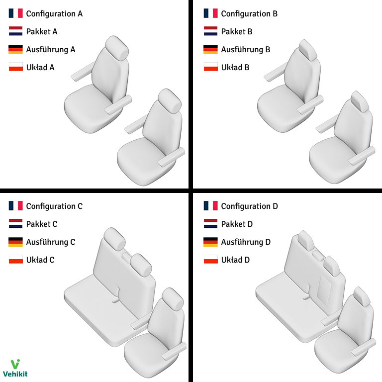 Deze hoezen zijn speciaal ontworpen voor uw Volkswagen Transporter. Ze sluiten perfect aan op de verschillende delen van de stoel of bank en blijven altijd strak zitten. Veiligheid staat voorop, dus deze hoezen zijn volledig compatibel met airbags. Bij een ongeval breken de elastische naden van de hoes gemakkelijk, zodat de airbag zich kan ontvouwen. Of u nu een bank of losse stoelen hebt, onze hoezen garanderen een optimale bescherming. Ontdek de verschillende beschikbare opties in onderstaande tabel, evenals de inhoud van elke set.