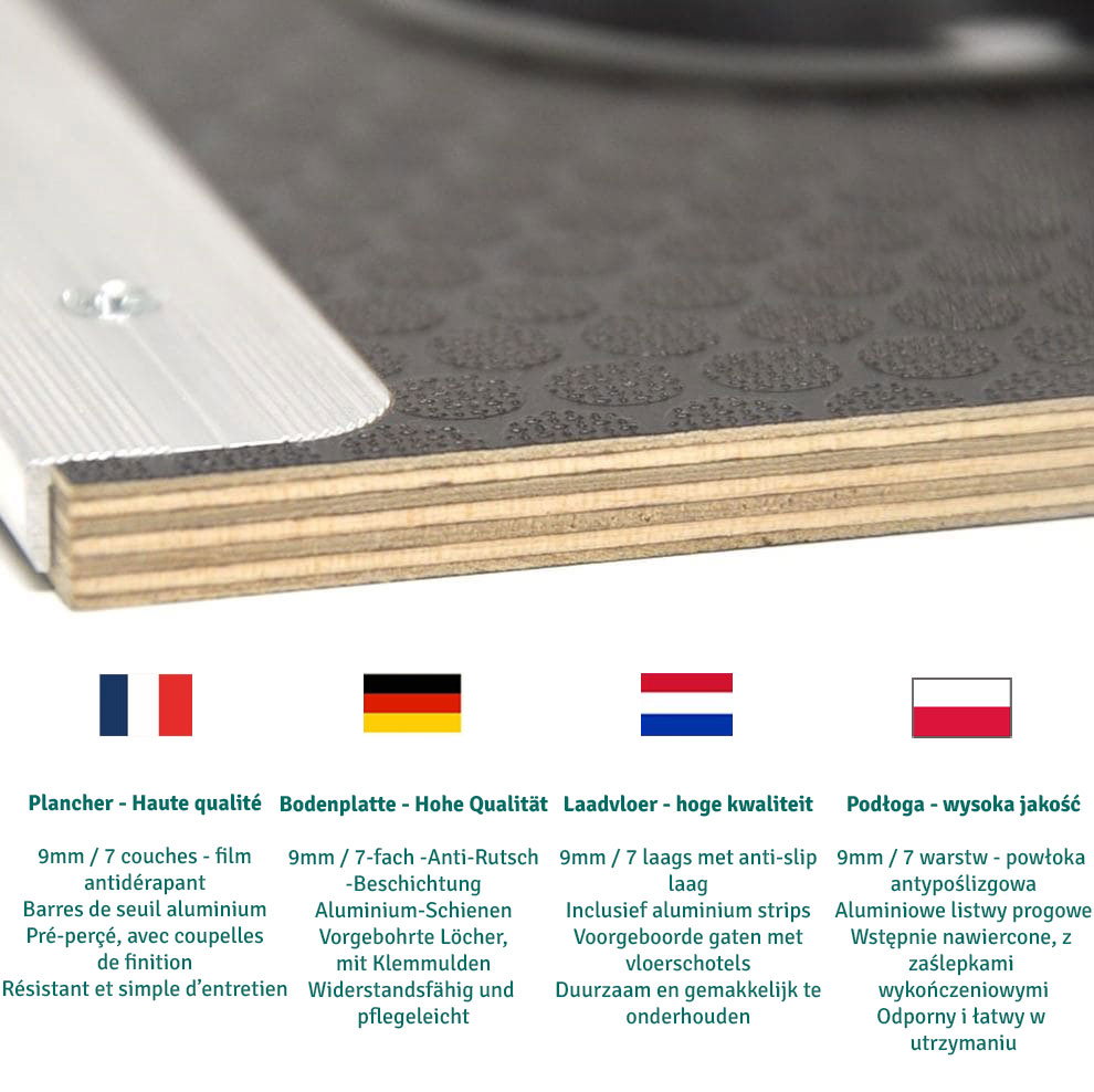 - Vloer: 9 mm/7-laags betonplex, met anti-slip profiel.