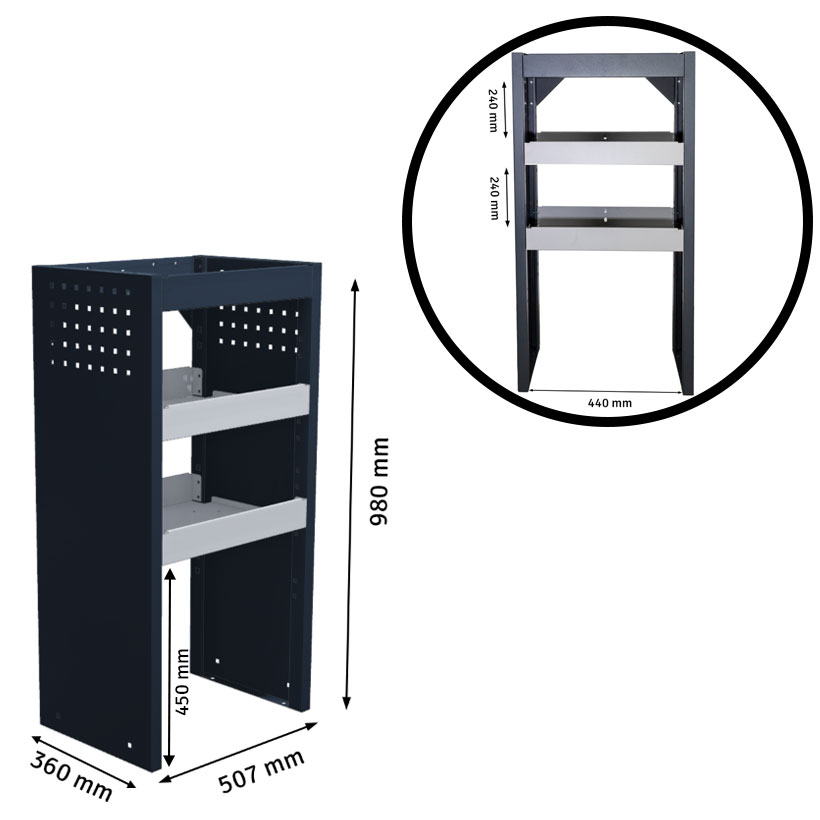 Deze kastmodule heeft stevige legplanken van 340 mm diep, ideaal voor het opbergen van gereedschapskoffers zoals Festool of Makita. De planken hebben een binnenmaat van 440 mm breed en een tussenruimte van 240 mm hoog. Daarmee heb je voldoende ruimte om jouw materialen geordend te houden. Elke plank heeft een draagkracht van 40 kg. Je kunt de inrichting altijd uitbreiden met accessoires die passen bij jouw werkzaamheden, zoals tussenschotten of antislip matten.
